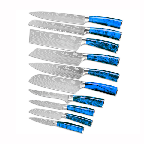 Xingye 10 pezzi manico in resina blu modello damasco coltelli da cucina Chef in acciaio inossidabile Set di coltelli professionali all'ingrosso