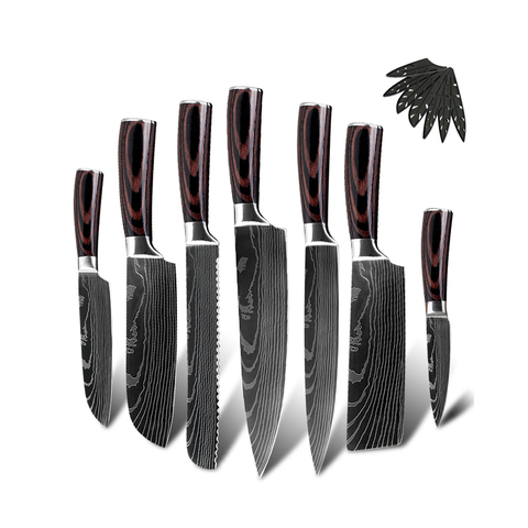 XYj commercio all'ingrosso OEM 7Cr17Mov 440C Laser In Acciaio Inox Giapponese Damasco Coltelli Da Cucina 7pcs Set di Coltelli Da Cucina Con Manico In Legno